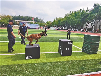 活动现场,广州市公安局番禺分局带来的警犬技能展示点燃全场热情。身手矫健的马努里阿犬、嗅觉敏锐的寻血猎犬、温顺友善的拉布拉多轮番亮相,在场学生目不转睛、欢呼不断。