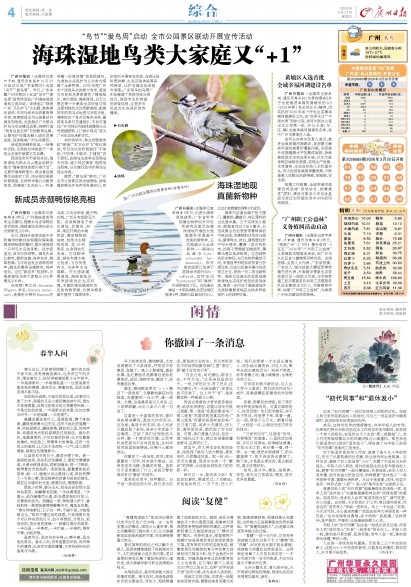广州日报讯 (全媒体记者叶卡斯 通讯员林园轩)3月20日至26日是广东省第四十五届“鸟节”“爱鸟周”。昨日,广东省暨广州市第四十五届“鸟节”“爱鸟周”宣传活动在广州海珠国家湿地公园启动。该活动以“绿美广东 万众护飞”为主题,聚焦普法宣传、专项行动和自然教育等内容,深度联动全市公园景区开展系列活动,全面展示广州爱鸟护鸟与生态建设成果,持续打造“我身边的自然”自然教育品牌,让爱鸟护鸟理念融入城市发展血脉,促进绿美广州生态建设。
