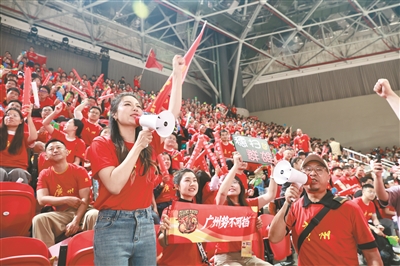昨晚的天河体育中心体育馆,广州队球迷统一身着红色应援服,组成亮眼的“红色海洋”,手持助威道具,用粤语口号“广州冇得顶”为家乡球队鼓劲;中山队球迷身着黄色应援服,手持“中山加油”应援牌,轮番合唱经典歌曲为球队助威。赛场之上,双方球迷文明助威、热情“斗法”;赛场之外,两队球迷友好交流、以球会友,红黄两色的应援海洋交织,完美呼应了广中双城同根同源的兄弟情谊,成为赛场边最动人的风景。