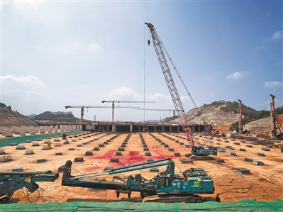 2024年11月,当本报记者再次来到这里,原本如油画般的工地已不见踪影,取而代之的是近万名工人忙碌的身影。广湛高铁珠三角枢纽机场站(后命名为:佛肇站)的建设工地,如同一条“巨龙”,延伸向远方。数不尽的桩机、忙碌穿梭的运输车、如积木般整齐的建筑以及线条优美的钢筋笼,都是工人们辛勤付出的见证。