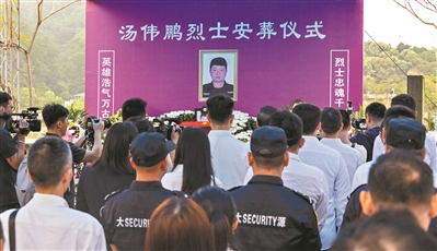 广州日报讯 (全媒体记者张丹羊、汤南 通讯员穗退役军人宣)青山巍巍埋忠骨,白云悠悠悼英魂。昨日,汤伟鹏烈士安葬仪式在广州市银河烈士陵园福山园区举行,社会各界人士列队肃立,送别烈士英灵,缅怀英雄壮举。