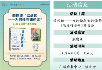 阅读点亮人生,浪漫浸润心灵。4月6日,读者们可以走进广州购书中心,与戴建业共赴一场思想之约。