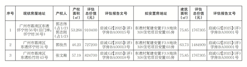 经《广州市荔湾区人民政府关于征收国有土地上房屋的决定》(荔府征房〔2025〕1号)批准,荔湾区东漖地块等3个门牌在上述征收范围内,房屋征收部门已对上述房屋及拟安置房屋进行了房地产价值评估,现将房屋的评估结果公告如下: