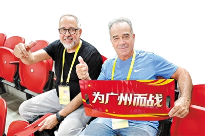 来自阿根廷的客商Gerardo Rossi(左)与朋友现场观看粤BA比赛。