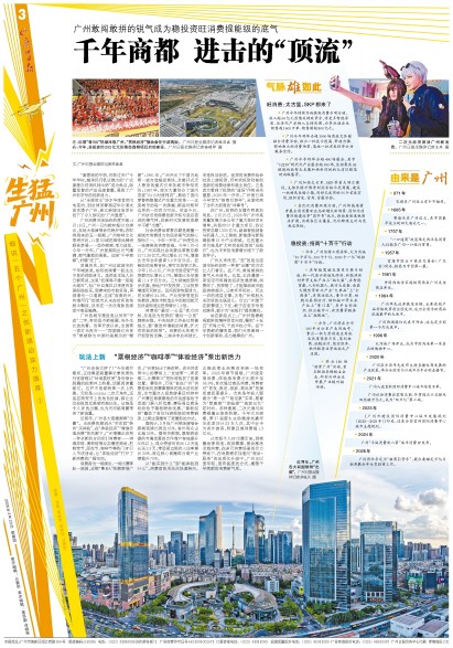 广州的城市基因里从没有“守成”二字,有的是不断破圈、向外生长的执着。改革开放以来,全国第一家灯光夜市——“西湖路灯光夜市”曾被称为中国时装展示的“橱窗”;1981年,广州开出了中国内地第一家自选超级商场,全敞开式无人售货的模式引来各城市争相效仿;1987年,南方大厦创办了国内首家“24小时便利店”,推动了国内零售销售模式产生重大变革……这座城市的每一次跨越,都是对既有边界的一次有力叩击。时至今日,广州依旧凭借着创新开拓与坚忍奋进的精气神,在新时代发展的浪潮中不断“出圈”。