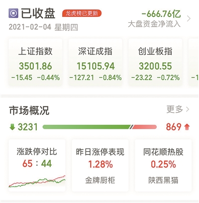 2月4日,A股三大指数全线低开,并集体收低,上证指数收跌0.44%,报3501.86点;深证成指跌0.84%,报15105.94点;创业板指跌0.72%,报3200.55点。