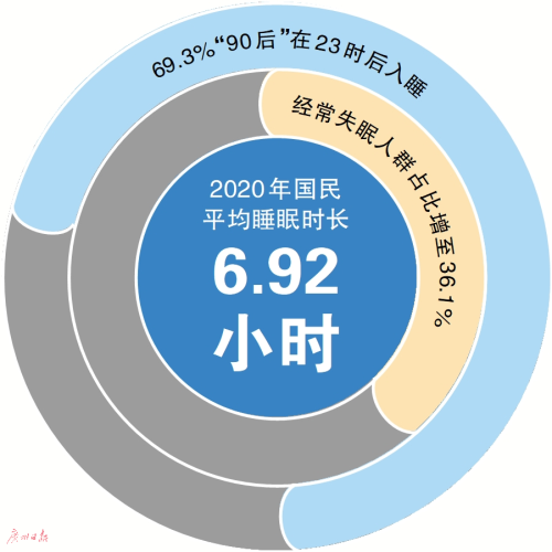 《2020年中国睡眠指数报告》指出,2020年国民的平均睡眠时长为6.92小时,经常失眠的人群占比增长至36.1%,其中年轻人的睡眠问题更为突出,有69.3%的“90后”会在23:00之后入睡,其中不少存在入睡困难。
