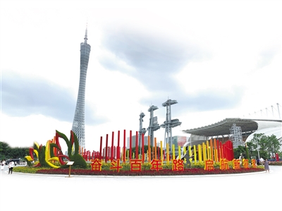 往北走,在东塔和西塔中间位置,“同心向党、同心出发”主题花坛更为宏大壮观,花坛设计为礼物盒形状,通过三面礼物盒的形式展示“初心”“使命”“展望”。花坛采用鲜艳盛放的红色木棉花形象,搭配彩色的城市背景,注入崭新的时代元素,寓意红色记忆和美好明天。“整个花坛以‘同心向党、同心出发’为主题,传承红色基因,牢记初心使命。”来自广州城投集团的姚小姐说。