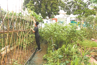 “低碳驿站”对面,是一片约1200平方米的社区农园。沿着小径深入,这里瓜果蔬菜连片种植,园林作物生长茂盛,每一块地都“名花有主”,挂着写有“焯哥农场”“甜甜农场”等“农场主”姓名的标签。每天清晨,村民们来到这里耕种,有的园林绿植长了一人多高,有的瓜藤已经爬满树藤,还有的橘子树上挂满了水果。