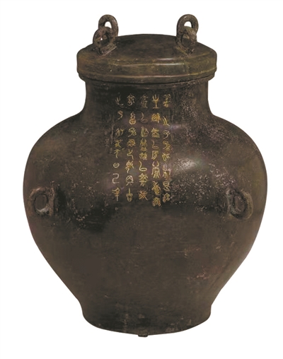 这件宝物是春秋时期器物,采用特殊工艺,在青铜器表面錾刻浅槽,在槽内嵌入金丝,再进行打磨。此缶盖内有错金铭文8字:“正月季春元日己丑”。器腹与颈部有错金铭文5行40字:“正月季春元日己丑,余畜孙叔也择其吉金,以作铸缶,以祭我皇祖,余以祈眉寿。栾书之子孙万世是宝”。此器为国家一级文物,现藏中国国家博物馆。
