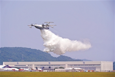 在第十三届中国国际航空航天博览会首日,由赵生、赵磊、魏鹏、张世海4名成员组成的机组按预定科目和计划,驾驶“鲲龙”AG600从珠海机场跑道起飞,进行飞行投水功能演示,9吨水随着飞机下部投汲水舱门的打开倾泻而下,精准覆盖投水目标区域,给依旧炎热的珠海航展送去些许清凉。