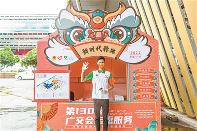 广交会期间,近1500人次青年志愿者参与到防疫宣传、口岸迎送、语言翻译、核酸检测、文明倡导等工作中来。5个醒狮造型的海珠区志愿者驿站分布在广交会场馆南北两面的步行主干道旁,站内摆放疫情防控物资、广交会展馆分布地图、雨伞、饮用水、应急药品、广州美食景点折页、海珠区概况介绍等物资,为中外客商提供防疫宣传、办证指引、语言翻译、场馆引导等服务。志愿者全部全程佩戴口罩,运用手套上的微笑贴纸展示“微笑”。