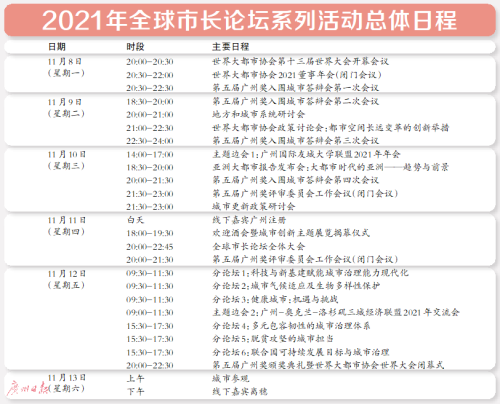 11月8日,举行世界大都市协会第十三届世界大会开幕会议和董事年会。会议聚焦“转型中的都市—重新思考共同的未来”,广州市将作为主席城市在开幕会议上致辞并主持董事年会。11月11日晚,举行全球市长论坛全体大会,联合国有关机构负责人、国内外城市市长、专家学者等嘉宾将以线上或线下形式出席并发言。11月12日晚,举行第五届广州奖颁奖典礼。11月12日还将举行6场分论坛,分别围绕生物多样性与城市气候、科技与新基建、健康城市等多个领域,邀请中外城市代表、专家学者等进行深入研讨。活动专门设置“脱贫攻坚的城市担当”分论坛,分享脱贫攻坚中国经验。会期还将举行“广州国际友城大学联盟2021年年会”和“广州-奥克兰-洛杉矶三城经济联盟2021年交流会”两场主题边会。城市创新主题展览也将以线上和线下两种方式同步展出。