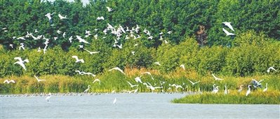 波光粼粼的湖面和浅滩上,白琵鹭、黑鸢、褐翅鸦鹃等鸟类在无忧无虑地觅食嬉戏,它们一会儿在空中欢聚,一会儿四处分散掠过湖面,勾画出一幅幅候鸟翩翩当空舞的美丽画卷。