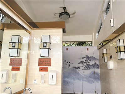 记者在女厕如厕区看到,现场共有19个厕位,每个厕位空间十分宽敞,安装有安全扶手,如厕后能自动感应冲水。如厕区还挂着中国风装饰画,并播放轻松悦耳的音乐,让人心情舒畅。