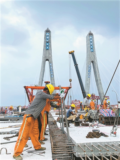 洛溪大桥新建桥梁主梁采用钢梁及混凝土桥面板组合梁,左右幅共计102节钢梁段,608片混凝土面面板,最大主梁横桥向19.5米,纵桥向为12米,最重钢混叠合梁为140吨。项目地处珠江主航道上,每日过往船只众多,加上疫情、台风、暴雨等因素影响,如何在最短时间内完成钢梁吊装,是大桥建设的最大考验。建设团队增派30多台套设备、400多吨支架和模板、200多名施工人员,0#和1#块钢混叠合梁由桥面散拼改为利用800吨大型浮吊整体吊装。标准梁段方面则投入8台桥面吊机开足马力吊装,仅用时179天完成了主桥钢梁安装。