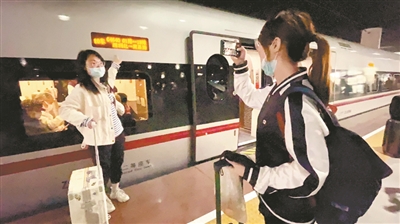 临列车开车还有10分钟,一对情侣在车头附近拍照留念。“这是我们在一起的第一年,有幸能坐上首发列车回赣州见家长,感觉很有意义。”唐女士说道。