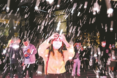 昨夜,广场内全新打造的地标性夜生活集聚地“天德快闪街”正式拉开序幕。“快闪街”设于广场的网红景点“火树银花”内,设计上采用了当下年轻人喜爱的霓虹、电竞等元素。现场,记者见到有不少年轻人在夜间飘落的浪漫“雪花”中拍唯美大片,又在酷炫的街舞表演中释放青春热情。