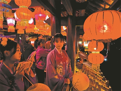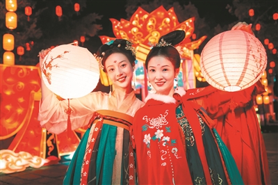 近几年,随着传统服饰潮流的回归,喜欢穿传统服装的人越来越多,很多市民都怡然自得地把传统服装穿上了大街。迎春灯会首夜,景区里到处都是身穿传统服装拍照留念的市民。