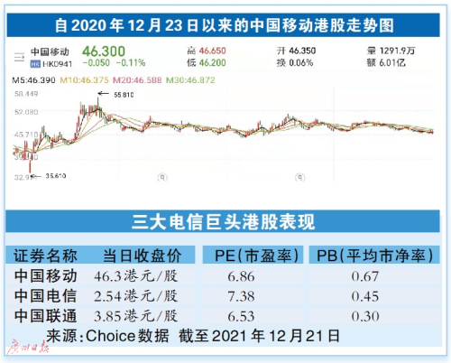 中国移动发行价对应的2020年摊薄后市盈率为12.02倍,低于当前中国电信和中国联通的市盈率(19.01倍和22.32倍)。Choice数据显示(截至2021年12月21日),中国移动港股PE(市盈率)6.86,PB(平均市净率)0.67,均处于历史底部区间。与中国电信(PE7.38; PB0.45)和中国联通(PE6.53; PB0.30)相比,中国移动PE估值位于中间位置,PB估值高于其他两家运营商。从分红来看,中国移动近三年分红派息率超过50%,2020年股息率达到7.44%,不论在港股还是在A股的大型公司中都名列前茅。