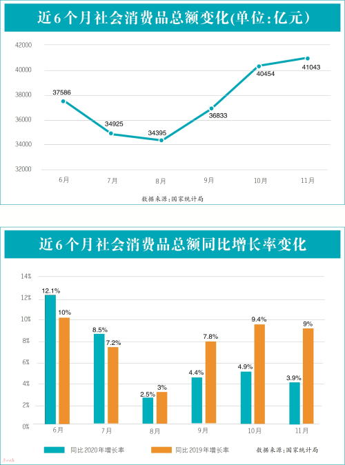 “不谋全局者,不足以谋一城”,何谓“全局”?可以先看数据。在消费端,今年1月~11月,社会消费品零售总额39.9554万亿元,比2020年1~11月增长13.7%,比2019年1~11月份增长8.2%。按国家统计局贸易外经司统计师付加奇的解读,这不俗的增长率里,“升级类和基本生活类商品”的销售增势较好、增速加快。