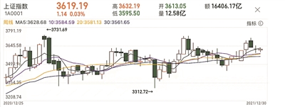 2021年即将收官。12月30日,A股沪深三大股指震荡收涨,截至收盘,上证指数涨0.62%,报3619.19点;深证成指涨0.97%,报14796.23点;创业板指涨1.25%,报3322.79点。拉长时间来看,截至12月30日,沪深两市A股年内总成交额逾256万亿元,超过2015年时的峰值,创下历史新高。 从具体板块来看,A股全年呈震荡态势,板块分化明显、轮动加快。一方面,新能源汽车、锂电池、储能、元宇宙等板块轮番上涨,另一方面,消费板块整体表现不佳,家用电器、生物医药、白酒等呈下跌态势。展望2022年,有分析认为,明年经济稳字当头,股市趋势性行情或难出现,全年A股市场或呈现“N”形走势,成长股和小盘股相对占优。