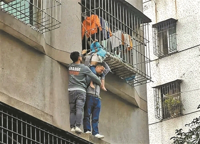 广州日报讯 (全媒体记者黄文生 通讯员开公轩摄影报道)1月2日,江门开平一4岁男孩独自留在家中时,爬上窗台掉落防盗网外,民警和群众及时伸出援手一起将小男孩救出。