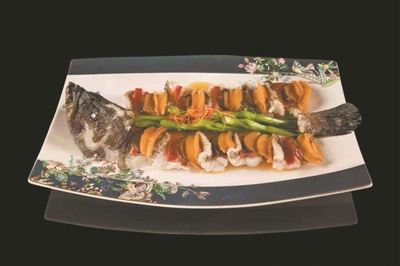 这道菜将传统白汁昆仑斑与昆仑鲍片相融合。细致的刀工,能让食材呈现出极致的美感。取鲜嫩龙趸、五头大鲍鱼、金华火腿、冬菇切成薄片,整齐划一地摆回鱼形,算上精准的蒸制时间,淋上粤菜里传统的清汤白汁,肉质弹嫩汁液丰盈,方寸间尽显厨师精妙的刀工火候,更是体现厨师对于传统粤菜传承与创新的诚意之作。