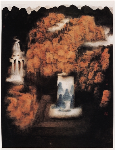 创作“静观”系列时,我认识到一点:当年风靡全国的“现代水墨”实验是把西方一些观念翻译、引进过来就直接套上去用了,对我来说这种方法已经不对了、不能满足了。由此,我开始思考中国人“天人合一”的精神——历史上传统对自然的认识、对微观的认识。基于这个思考,我用青花瓶作为视觉符号,打破了室内、室外的界限,从宏观角度,构成了一个我当年的认识。我还是用宣纸与毛笔来创作,只不过通过笔墨来体现的是新的理念。