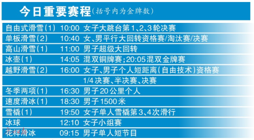 2月8日,北京冬奥会展开第四个金牌日的争夺,今日也是本届冬奥会单日产生金牌最多的一天,会进行10个项目的争夺,将产生10枚金牌,分落在自由式滑雪(1)、单板滑雪(2)、高山滑雪(1)、冰壶(1)、越野滑雪(2)、冬季两项(1)、速度滑冰(1)、雪橇(1)。