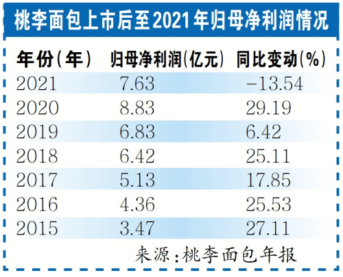 桃李面包股份有限公司的前身,是成立于1997年的沈阳市桃李食品有限公司,截至目前,公司拥有37家子孙公司,在全国市场建立起26万多个零售终端。2015年,桃李面包登陆A股市场,有“面包第一股”之称。记者梳理桃李面包上市以来的年报数据发现,2015-2020年,公司归母净利润从3.47亿元稳步增长至8.83亿元,除2019年同比增长6.42%外,其余年份一直保持同比两位数的增长。2021年是桃李面包自上市以来,归母净利润首次出现负增长。