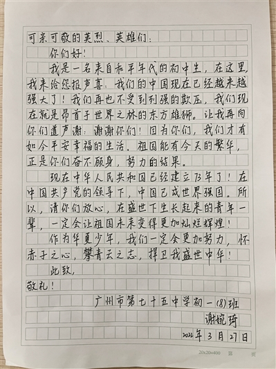 “感谢你们,亲爱的先烈们”。3月29日午后,广州市七十五中学的一间课室里,13岁的谢婉琦小心翼翼,将写好的信誊写到信纸上,写下了上面的第一句话。刚刚步入初一的她,对英雄志士在生死之际做出的抉择愈发好奇。每一次在课本上,在老一辈的口述中听到烈士的故事时,她不禁在想——“到底是什么驱使这群人不惜一切选择了牺牲,如果当时的那个人是我,我又会做出怎样的选择?”