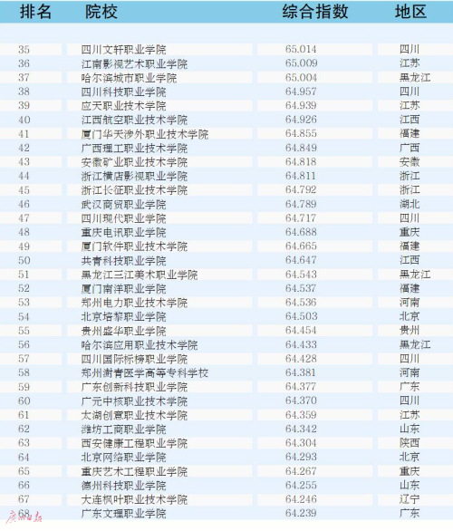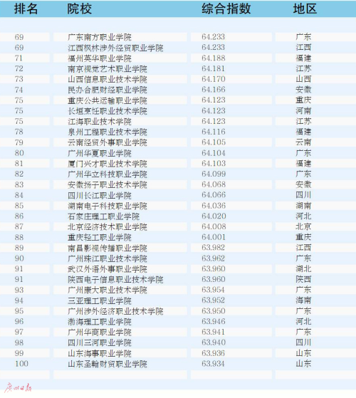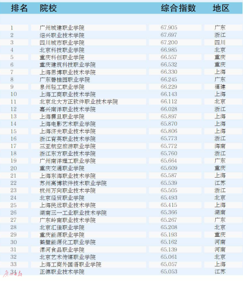 广州城建职业学院在“GDI高职高专(民办)TOP100榜(2022)”中位居榜首,绍兴职业技术学院和四川城市职业学院分列第二、第三位。