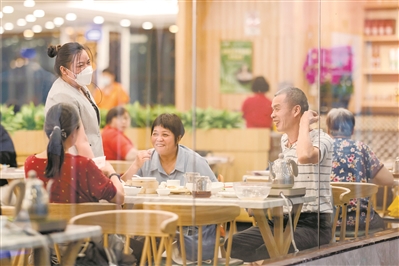 “前一天晚上就留意到恢复堂食的消息了,终于可以来叹一叹啦!餐厅旁边是公园,每次吃完饭我都会在公园散散步,帮助消化,也呼吸一下新鲜空气。”家住附近的唐老先生说,昨日,他特别点了自己喜欢吃的点心:虾饺和干蒸烧卖。海珠区部分恢复堂食的首日,有不少老人家带着幼儿园的孙儿到餐厅来用餐。