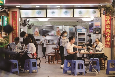 “终于开放堂食了!”在一家茶餐厅门口,一个年轻女孩惊喜地对同行朋友叫道。记者随她们一起走进茶餐厅,看到店内已有不少年轻人入座。自称“职场打工人”的阿文表示,以前常来这家茶餐厅喝柠檬茶“续命”,铁板牛扒大虾更是让辛苦一天的他拥有一点慰藉,“这里可以说是我的‘回血’空间了,食客的八卦聊天声,服务生亲切的招呼声以及茶餐厅独有的气味,是外卖替代不了的。所以一开放堂食立刻又赶来支持!”