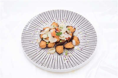 采用林芝当地羊肚菌,酿入细腻虾滑,制作成一道粤菜特色菜“虾胶酿羊肚菌”。