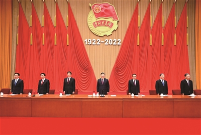 人民大会堂二层宴会厅气氛隆重热烈。主席台上方悬挂着“庆祝中国共产主义青年团成立100周年大会”会标,后幕正中悬挂团徽,团徽下方是“1922-2022”字标,10面红旗分列两侧。