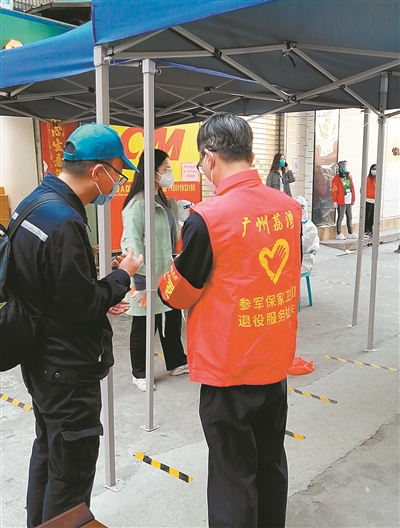 4月13日起,海珠区军休所接到支援任务,选派4名党员干部,“老兵带新兵”的组合连夜集结,以最快速度奔赴海珠区南洲街道封控区域一线,配合开展做好重点区域封控和核酸检测等工作。