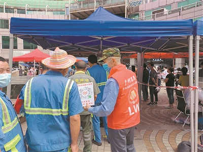 4月8日晚,大东街新南社区的在职党员群里,社区主任“兵支书”武文华转发了越秀区要开展大规模核酸检测的通知。虽然还没提及要招募志愿者,但身为红棉老兵志愿者,广州环投集团员工陈红平立马赶往社区的检测点帮忙。