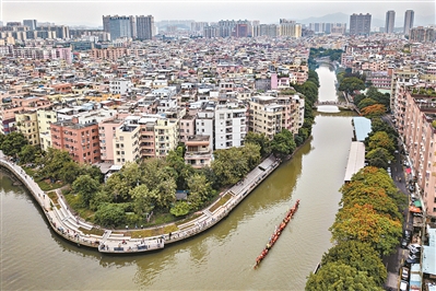 这时,鼓手擂响了龙舟鼓,龙舟划手有节奏地齐齐划桨,伴随着岸上阵阵鞭炮声和龙舟上阵阵鼓点,插满祈求风调雨顺锦旗罗伞的新“东坡号”,在两岸村民的注目下,开始了在车陂涌的首次巡游。乌黑的船身劈开清澈的水流,与岸边各色花卉、蜿蜒的碧道相映成趣,从空中俯瞰,一幅岭南水乡风情画在眼前徐徐展开。