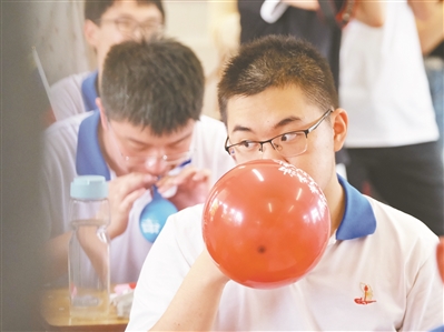 在高三(4)班,班主任兼物理老师游艳琳为她最爱的学生们准备了福气大礼包,每一件礼物,都蕴含了她对学生们的祝福:10秒挑战吹气球,寓意“思如泉涌,一气呵成”;打开红纸闯迷宫,从出发点连到理想的大学,象征着“好运连连,福气满满”;粽子形状的小挂件,绕到手指上转一转,蕴含“高‘粽’状元”之意;新鲜的杏子,代表“幸运和幸福”。