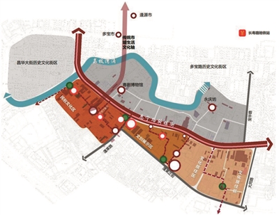 昌华涌滨水广场、逢庆大街、新恩宁市集、非遗文化工坊、十二甫西桥广场、恩宁后街、天佑广场、粤剧大院、美食潮楼和医药宿舍。