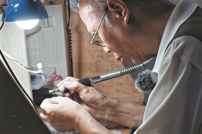 穿过荔湾区耀华西街和兴贤牌坊,向前约50米再右拐,沿着耀华南街一直走到底,靠右面有一栋古香古色的西关大屋。广州玉雕省级非遗传承人尹志强正端坐在工作台前,专心制作一枚翡翠玉叶,手中电动工具嗡嗡嗡作响,工作台右上方的水管不停地往下滴水,雕琢声和水滴声汇成一首动人的乐曲。“这里叶子的茎要厚一些,叶尖要往回勾一点……”尹志强一边小心翼翼地雕琢,一边耐心地给记者讲解。