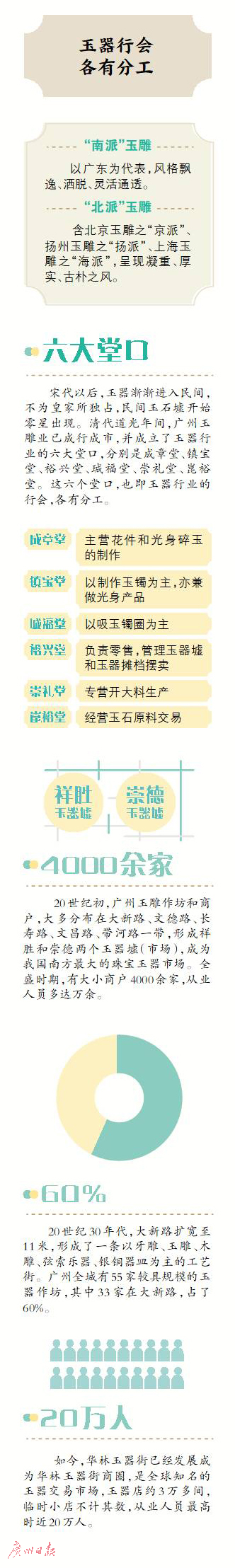 20世纪30年代,广州玉器业兴盛,有大小商户4000余家,从业人员多达万余人,主要集中在大新路、文德路、长寿路等一带,形成祥胜和崇德两个玉器墟(市场),成为我国南方最大的珠宝玉器市场。一时客似云来,货如轮转。