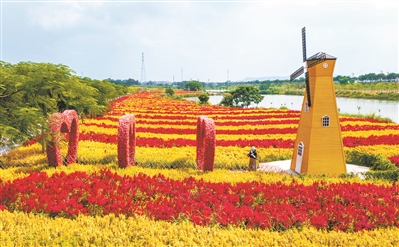 穗冠花花型直立形似火炬,花穗呈羽毛状,生于枝顶,其花语为“真爱永恒”。大片大片炫目热烈的火红色和金黄色穗冠花两色交错,团花簇锦,远远看去就像是油画一般,美不胜收。风车、鲜花爱心拱门等点缀其间,与穗冠花相映成趣,吸引了不少市民来此拍照打卡。据悉,穗冠花花期将持续到月底。
