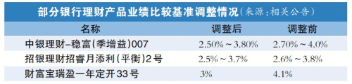 与此同时,多家银行理财子公司对理财产品业绩比较基准进行了调整。其中,中银理财近日发布公告称,于2022年8月9日起对“中银理财-稳富(季增益)007”(WFJZY007A)产品的业绩比较基准进行调整,由2.70%-4.00%(年化)调整至2.50%-3.80%(年化),即在原业绩基准基础上下调了20个基点。招银理财也发布公告称,拟于8月17日对招银理财招睿金鼎七个月定开1号固定收益类理财计划第4个投资周期业绩比较基准进行调整,调整后的业绩比较基准为2.8%-4.5%。