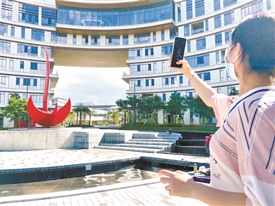 肖诗诗说,她的男朋友今年将去香港科技大学读研。红鸟日晷是香港科技大学和香港科技大学(广州)共同的标志。走到红鸟日晷广场前,肖诗诗拿出了和男朋友的信物,拍照“打卡”。