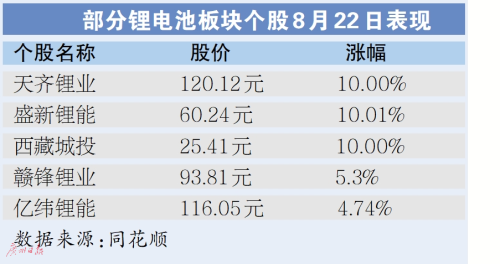 8月22日,据同花顺数据显示,天齐锂业、盛新锂能、西藏城投、利元亨等锂电池板块个股涨停,亿纬锂能、赣锋锂业等个股涨幅均超4%。作为动力电池的关键原材料,从2021年初,国内电池级碳酸锂价疯涨至今年一季度,一年多时间涨10倍。有专家表示,近两年锂价上涨主要是需求端比供给端更容易扩张所导致。