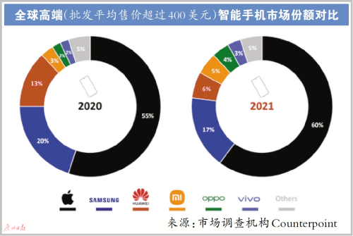 市场研究机构Counterpoint Research数据显示,相较于2021年全球智能手机7%的增速,2021年全球高端智能手机(平均批发价400美元以上约合人民币2540元)的市场销售额同比增长达有史以来最高的24%,增速超过整体智能手机市场。值得注意的是,高端市场在全球智能手机市场27%的份额也达到了有史以来的最高。