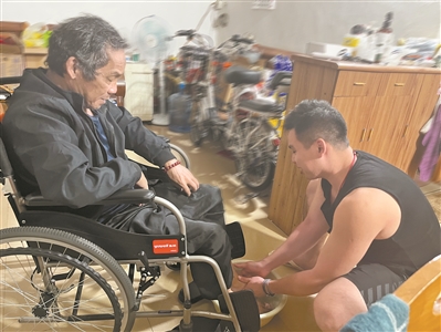 为父亲擦洗完身体后,汤明杰还要为父亲按摩双腿。“力道重吗?疼不疼?”他边按摩边关切地询问。汤东汉的腿对天气变化很敏感,最近几乎每到半夜他都会感到不适,这时汤明杰就要起身为父亲按摩腿部,让他好受点。